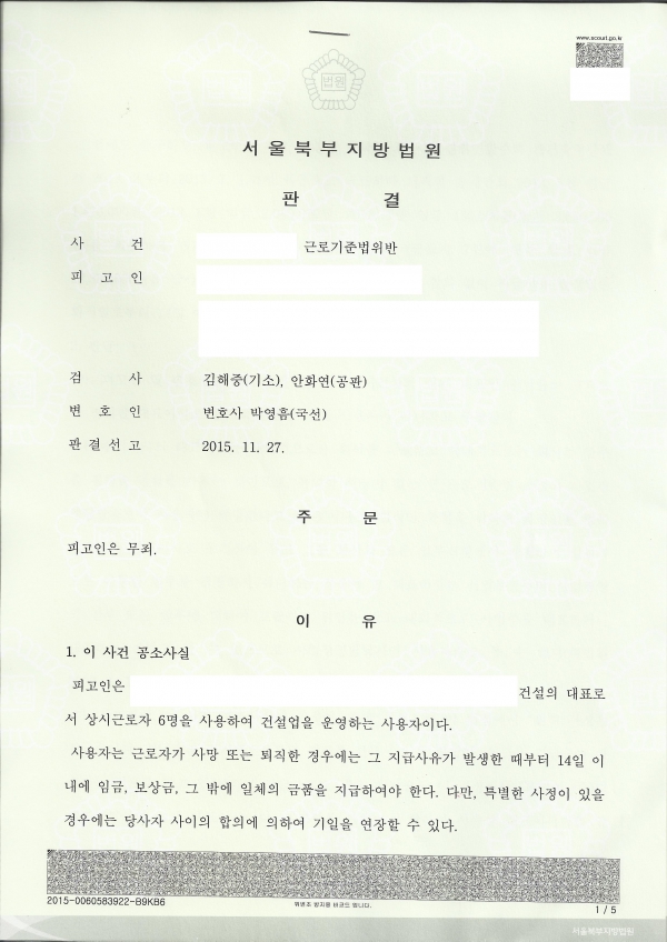 박영흠 변호사 국선변호 무죄판결(근로기준법위반)